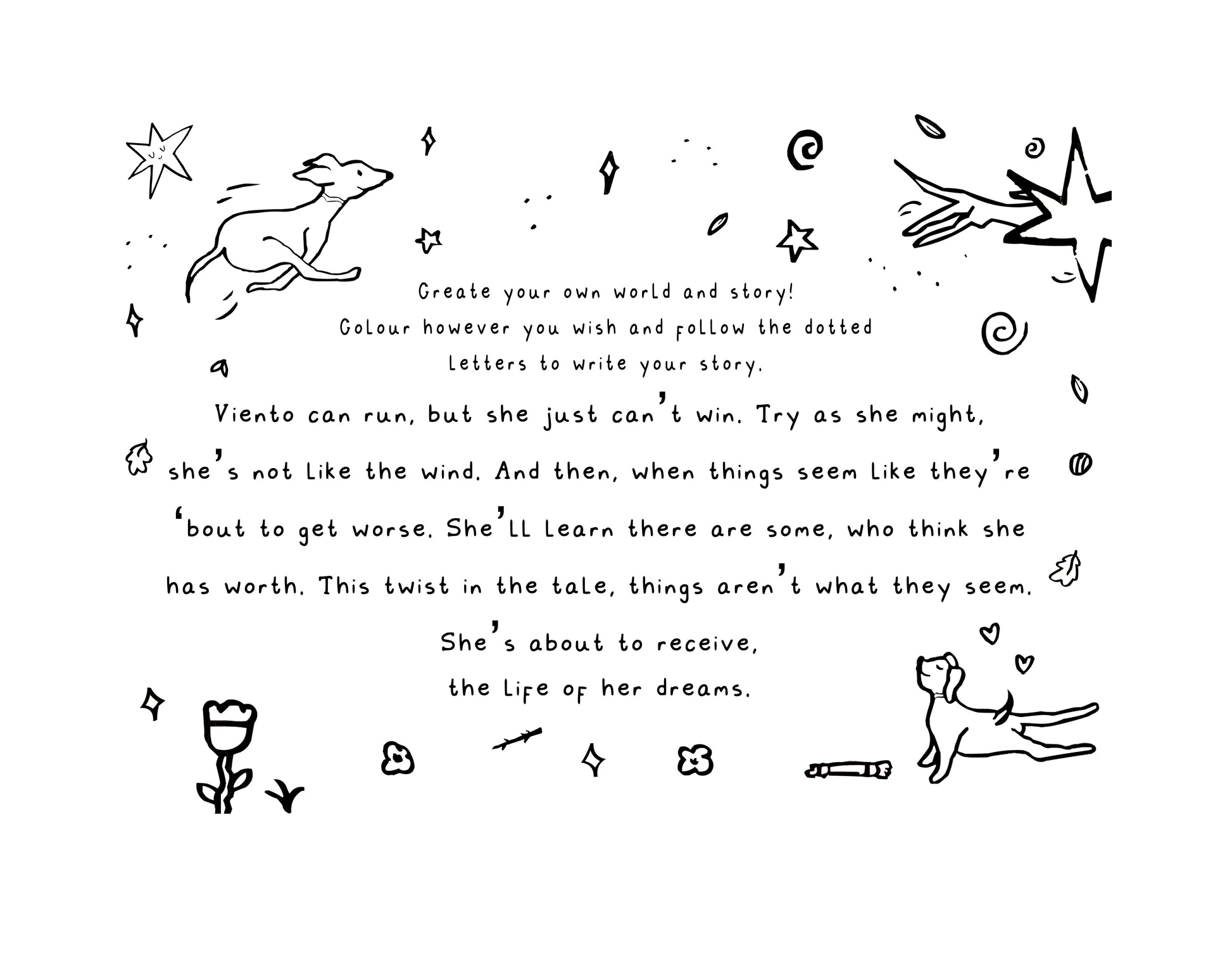 Colour the book or copy the pages and colour those instead. Then you can keep writing Viento's story and continue to bring colour to her world.